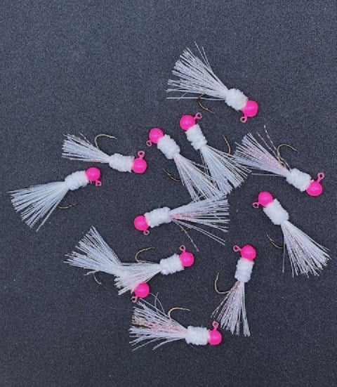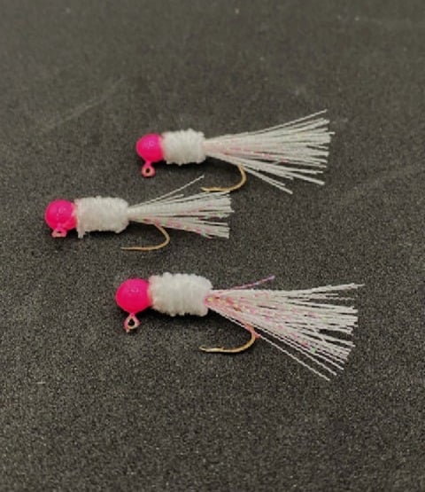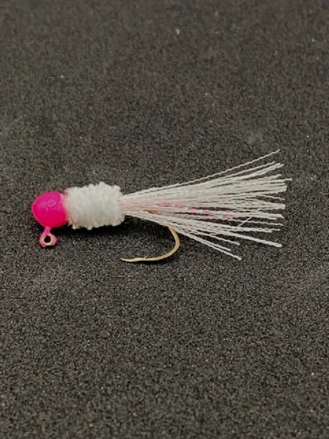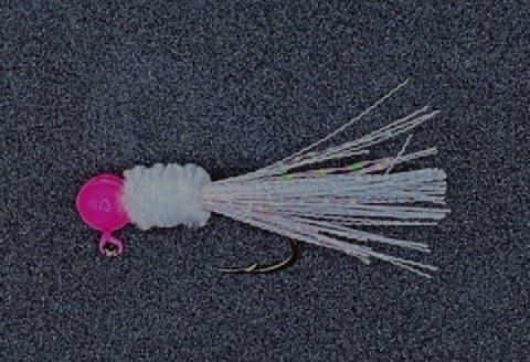 Pink jighead, white chenille, white tail with pink flash, Eagle Claw sickle hook. Classic pink and white jig, still works great.
